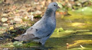 De houtduif is grijs van kleur, heeft een witte vlek in de nek en een brede...